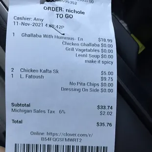 Decided to get some carry out from here, so there wouldn't be a need to go back out once I was done running my errands on my day off today. Ordered a chicken gallaba hummus, spicy, cup of lentil soup and a large salad and two skewers of the chicken kafta kabob. The order takes about 20 minutes to make. The salad is decent. It's a good size and the dressing isn't bad either. Some onions would give it more bite and flavor. The hummus is smooth and tasty. Goes well with the chicken gallaba. The lentil soup is so bland and boring. My husband didn't want it, it was that bad. The chicken and veggie gallaba tastes good, nice zesty flavor, but there's tiny bits of chicken and not much to qualify as a meal. What's more is the chicken gallaba is all veggies with a few small bits of chicken in it. I could only find 2-3 pieces in the entire dish. Additionally, this is supposed to be a meal and the grilled veggies takes up 2/3 of the carry out container. The hummus side with the gallaba comes wait two pocket pita and a baggy of store bought flat pita.