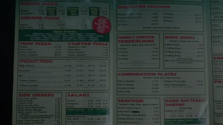 Primo's menu