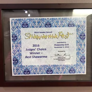Received the 2016 Greater Detroit Shawarma Fest award for best shawarma by both the judges' and people's choice !