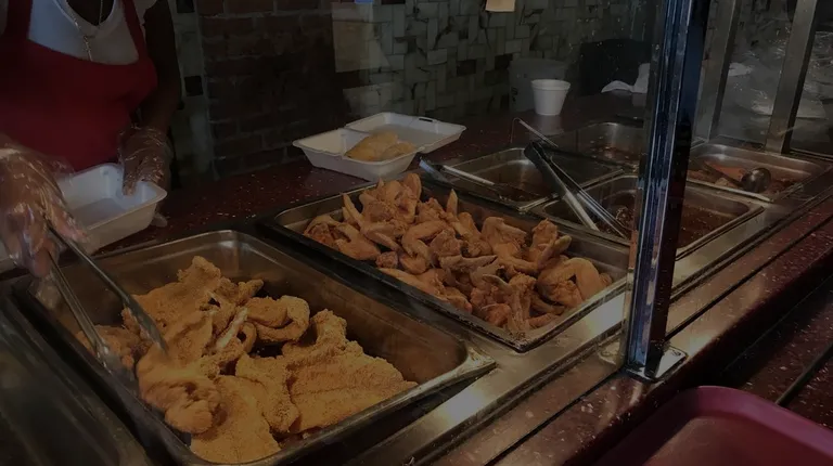 There is typically plenty of street parking, but it can get a little packed during lunch rushes. My friends and I came in around 1pm on Sunday. The line wasn't too bad, but around 2pm it got packed. People were most likely coming after church.There is no menu or prices at the beginning of the line. They serve the food like a cafeteria. The price for a dinner, one entree and two sides, is $13. We ordered the fried catfish, short rib, fried chicken wings, and bbq pig feet. Everything was really good! I especially like the fried catfish with hot sauce and the bbq pig feet. The pigs feet was extremely tender and melted in my mouth!Overall, good soul food, good portions, and a good price.The line gets a long because there is only one register and that same person also gets desserts so there's a bottle neck.
