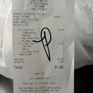 Or placed 8/9 at 4:51 pmFood- I suggest not to to order Sy Pad Thai.The pineapples are not bad, but the noodles in the pad thai are very watery.Shrimp were good size could have had a little bit more flavor.Food - added baby corn to my veggie Pad Thai the baby corn was amazing. I chose a medium spicy level. And it was not very spicy.SERVICE - was great and very helpful Ambiance - the vibe is cool and relaxing , there is inside dining. My order was to go, but I waited for my order and it was pleasant inside.2 Stars because I came here for the food... and for the price I was not pleased.Suggestion for Pad Thai would be Pi's Thia & Hazel park Mi