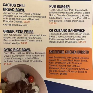 $16.24Seasoned Ground Beef and Chili rolled in a flour Tortilla Wrap topped with Chili and Cheddar Cheese. Lettuce, Tomato, Onions, Salsa and Sour Cream on the side.