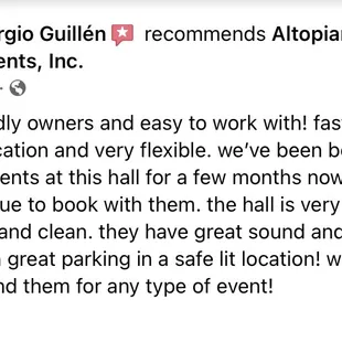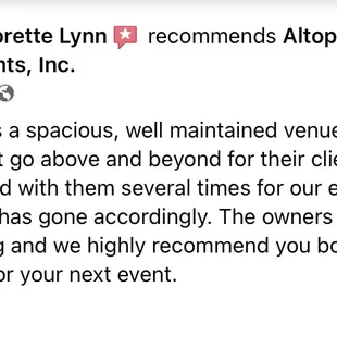 We used Altopiano for a family funeral. The owners were extremely easy to work with and very friendly. The hall was the perfect size and temperature with many accommodations. I highly recommend using Altopiano!