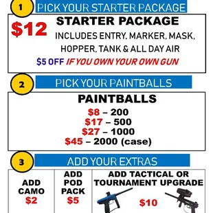Purchased a groupon for $25 for 4 people, includes equipment, air, and 100 paintballs. Once we got into the game we purchased more paintballs. They don't provide any protective gear so if you are interested in that bundle up. The fields are great but the nets are torn so be careful when close to edges. The restrooms are port-a-potties so just letting you know. They have benches for those who just want to watch. Overall we had a blast!