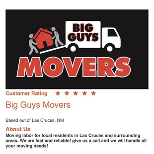 Today was moving day and I had scheduled Big Guys Movers to come out to load everything in the truck. They were wonderful! Two friendly guys arrived early, got organized and loaded the truck up super well. Everything fit great. They were careful with everything and were really safe working together with how they moved things. They quoted two guys for two hours and they nailed it. It was done in two hours! Don't pass up the chance to give this company your business when you need things moved and packed. A+Affordable, efficient and made our hectic day so much easier.