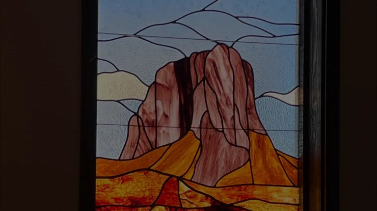 Stained glass image of Guadalupe Peak, at the Cactus Cafe in White's City, NM.