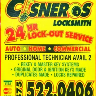 Drove down from California today to fix up my property only to find out I wasn't able to get in. I was completely stressed out until I called up Cisneros. They were the only lock Smith's in town that actually answered the phone! Think the guys name was Roger that helped me, he did a remarkable job! Customer service was amazing, Roger arrived quickly, and was able to get me into my property without any issues. Also saved me money on having to replace all the locks! If anyone is in need of a responsive and reliable lock smith Cisneros is the company to call. I'm impressed, thanks again for the awesome service!
