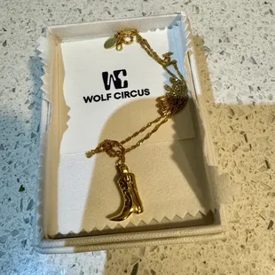 my new fav necklace - gold cowboy boot on a chain, perf for Tejas!