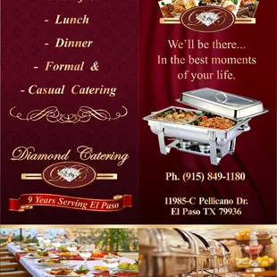 Diamond Catering offers top notch catering services with well designed packages at a reasonable price. Their service is friendly and communicative, and they are very accommodating of questions and customizations in planning out your event services. If you have an event in the El Paso area, I would absolutely recommend talking with Diamond Catering to explore your options and schedule a tasting.