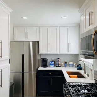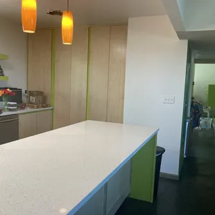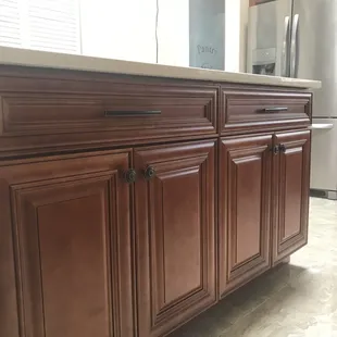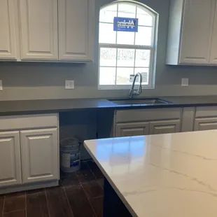 have had a very unprofessional experience with this company from both the cabinet and countertop install. The white quartz countertops were lying in the bed of a large truck when they arrived, not covered. The men installing were in an obvious rush and installed very quickly. They left debris in the front of the house and a mess in our kitchen. One section was a waterfall finish that was installed incorrectly, and they told us the cabinet people would fix the large gap btw the cabinets and counter. The owner of the countertop part of the business was not present and had these workers demand the rest of the payment at the time. When the owner followed up with these workers, they told him they were in a rush and didn't want to take the countertops back outside to cut them due to the weight. We waited several days to have the waterfall section fixed. They did not clean the countertops such as black gashes, rust color under the exposed under section, and did not repair the chips on the edges. They have yet to come back and fix the chips or clean the hard to remove residue and other marks. We have a contract with this company but like anything we have unfortunately already paid in full, and no one has come back to fix. After just a few months the paint on the cabinets are showing wear and tear where the handles are (pics). We regret going with this company. Family and friends have asked if we recommend and we have warned them to stay away from this company. Bad business practices.