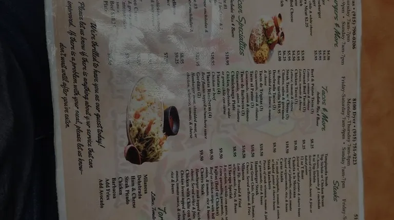 A hidden gem in North East right off 54 and Dyer. Been coming for years and I'm always satisfied, great food, good prices, and good portions. Real authentic Mexican food . Breakfast all day is the best. I work on Ft. Bliss doing construction and I always recommend it to the contractors who come from out of town.