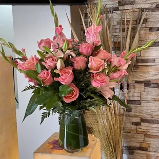 A stunning bouquet of pink roses and red spray roses elegantly arranged in a pink glass vase...