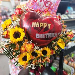 happy birthday red roses baby breathes, greenery, round 8' box astromerias, mylar balloon. 95.99 similar style