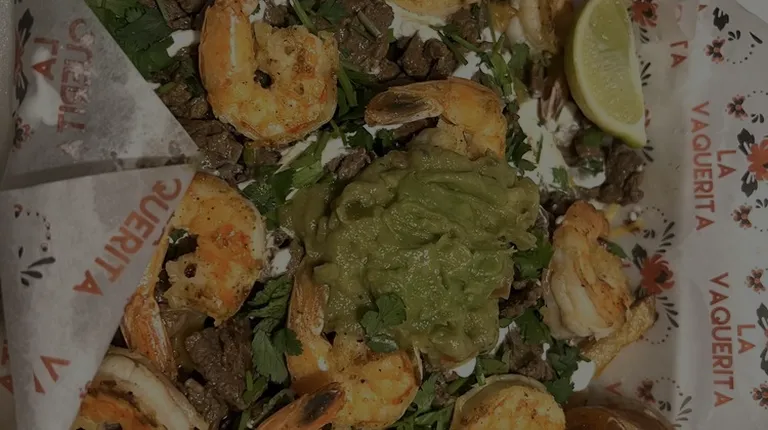 Freshly cut fries, shredded cheese, guacamole, sour cream, and cilantro.