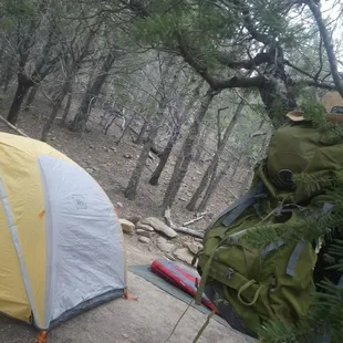 I hiked in from McKittrick Canyon (7.5 Miles) as opposed to from the Visitor Center (12 Miles). Everyone tried to talk me into doing the opposite, but I am glad I did it this way. The climb up was steep and had a bunch of false summits, but once you get into the forrest you are almost there. Camp has eight pads set up for tents, and there are stones big enough to sit on. The cliffs with amazing views from the edge of the ridge are only about one hundred yards from camp. The camp is not set right on the cliff, and this is nice because it is just down on the other side of the ridge far enough to be blocked from the wind. Also, there are large trees which afford shelter and a place to hang a hammock. This place is well worth the workout. I went on a Saturday night at the end of March and there was only one other small group at camp.