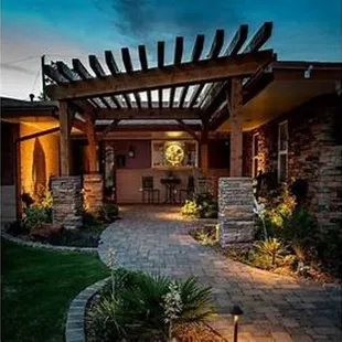 a patio with a fire pit
