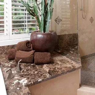 a kitchen with marble counter tops and a center island