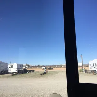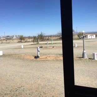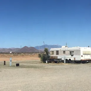 Very nice people! VERY WINDY. Between the interstate and the train tracks-ALL NIGHT noise. 360 views of mountains. No reservation needed, very flat desert space. Full hookups and wifi. Little store with fresh jerky and Stop over place only. Four stars bcz: No shower house and no shade. No dog area, thorns everywhere which injured their feet. Lots of permanent residents there and trash around their homes.