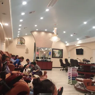 Grandma, son, granddaughter and I were all seen at once. They got us all seated and started on us within 5-7 minutes. Staff is friendly and conversational. Good music playing overhead. Nails came out great. Price is reasonable, you get what you pay for, with options ranging from $32-$60 pedicure. My daughter got an acrylic nail job and they came out great!