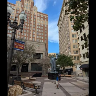 Full of history, Pioneer Plaza was once the 'main event,' later it was replaced by San Jacinto Plaza for more space.This plaza holds the XII Traveler series monument to Fray Francisco, El Paso's 'mission builder,' along with the grounds of the Newspaper Tree - where stories were tacked to the tree for reading and socializing.Also close by are the 'Bienvenidos' door by Chris Weed that stands as a doorway to Old El Paso. We also crossed the street to see the monument symbolizing the meeting between Black Jack Pershing of the U.S. and Mexico's anti-hero Pancho Villa.The value...it's all FREE and very walkable.It's fun to get out and about on a post rain evening in El Paso.