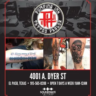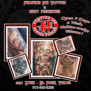 Great staff and artistic skill all around. I heard that this was the best place in El Paso and surrounding areas to get a tattoo, so my friend and I went there. Lo and behold, we ended up going three days in a row to finish our tattoos. My artist, Meteor, was excellent as a professional and as a skilled artist. My only complaint is that I didn't realize that I had sensitive skin, so I ended up with an allergic reaction to the ink. I ended up putting Neosporin on it and it's slowly healing. I know that technically it's not Meteor's fault, but I wish I had a bit of advice on what to do when confronted with this, other than the paper slip of directions that they handed me. Will definitely come back, and hopefully use another type of ink for sensitive skin.