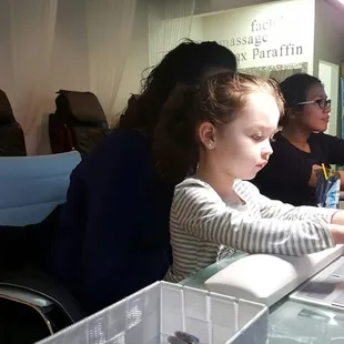 The entrance, waiting area, and a manicure bar! They offer you refreshing beverages while you're being served.