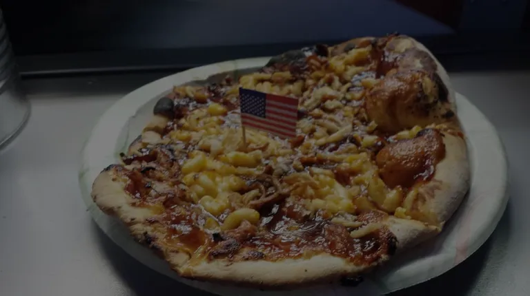 Red, White, and Chew is all about two things: tasty pizza and putting tiny U.S. flags on tasty pizzas. It just so happens that I love tasty pizzas and I love America, so naturally I liked RWC. They're a fairly new food truck in town and you can find their current location on their facebook page, I found them at a Food Truck Revolution stop.They make all kinds of pizzas, you can choose your own toppings or pick from one of their special creations, I went the special route, because I'm special. When I asked what they recommended, she asked if I was feeling a little crazy, and suggested I try a BBQ Pulled Pork and Mac & Cheese pizza, and I went for it. We're never going to survive unless we get a little crazy.The crazy pizza was crazy yummy, and logically so: pizza is awesome, pulled pork is awesome, mac & cheese is awesome, and tiny American flags are awesome, it's awesome to the 4th power (the flag adds the flavor of freedom). Pizzas are thin, but not crispy thin crust, which I like, as I prefer a soft crust, they're personal size, but very filling. They have a wide selection of toppings, so the possibilities are pretty endless. They also have other stuff, I ordered some wings because: a. they were on the specials menu and b. this is America, and we eat wings with our pizza, love it or leave it, pal! Wings were alright.Look for them on your next food truckin' adventure!
