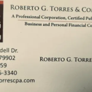 Robert G Torres & Company is an El Paso based accounting firm. I have acquired outstanding professional tax services for the past 20+ years. As a small business concern, it is imperative to have an accounting firm that assists in creating a foundation of operation and knowledge with the small business owner. The Torres Company is the small business person's accounting firm. The value of knowledge and assistance far out weighs the price one pays. If you are a small business concern or looking to establish a business, I highly recommend Robert G. Torres & Company.