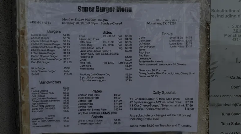 All you gotta do is read the other reviews if you're not sure what to get or if this is the place to go - let me make it easy for you - THIS IS THE PLACE TO GO.The bob pal burger is literally the best burger I've ever eaten in my entire life & I am not exaggerating one bit. Been living in Monahans my entire life & my dad used to take us for Bob Pal burgers every now & then so I get a little bit of nostalgia everytime I do get to go. THE ONLY DOWNSIDE: I just wish they were open later. The building has a retro, hang out & grab a bite to eat vibe and with some updated lighting, this could be a hometown stamp that all Monahans people are proud of! (Not that we aren't very proud already! )