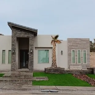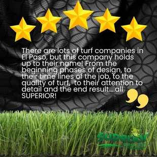 I am so pleased with the way my landscaping turned out. Superior Green Turf handles my estimate with professionalism, courtesy, and ease of scheduling. The estimator came out and measured on a Thursday (before a holiday) and they were starting work the following Tuesday. The fees were broken down and up front from the beginning. Nothing changed from the time of my estimate to my final payment. If you don't know anything about artificial turf, you should ask around, because it is pretty pricey, so don't expect it to be cheap. But SGT has the most competitive prices in El Paso since most of the landscapers get their turf from them!The actual landscapers worked very well as a team, and they were very respectful to me and my family. They showed my kids and I what they were doing and even offered to let us put our hand prints in our fresh concrete. They worked so hard to get the job done within three days, but did not rush. I could definitely see the balance of them taking their time and getting the job done as expected. As they were putting finishing touches on the yard they actually brushed the turf, raked rocks and swept up all the dirt. I never thought I would be so happy about rocks and fake grass.