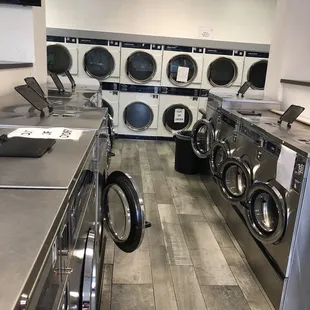I had high hopes for this laundromat and was excited to have one near my apartment, (this location used to be Bronx Deli) but this place was a huge letdown. I figured that with "The Cleaners" backing the name, it would be a nice facility, but it's not. The place opened within the last few months and already looks rundown and dirty. The machines are scratched and the dryers are noisy, I'd say these are recycled machines from a retired location. The machines are coin operated and there are two change machines. Restroom at 10:00am was filthy. A few pluses: they offer free Wi-Fi, tables have an outlet if you need to plug in, but not good for folding laundry larger than a T-shirt or jeans, the laundry carts are in good condition and so are the chairs and tables.