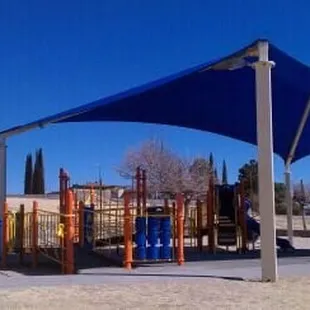 Playground equipment under large sunshade.
