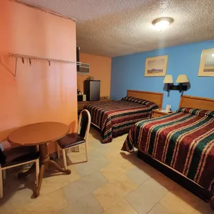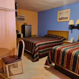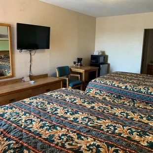 Older property. Micro, fridge, in room coffee service. Laundry available. Clean room. Needs updating. Furnishings still functional but worn. Adequate plugs for electronics.