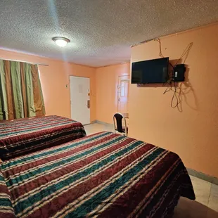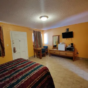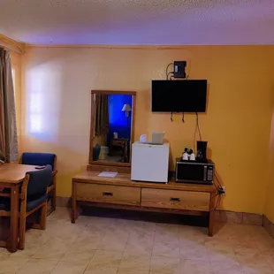 Interior: superbly clean room with the essentials of a mini-fridge/flatscreen TV/microwave