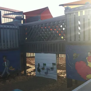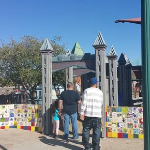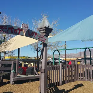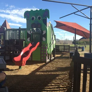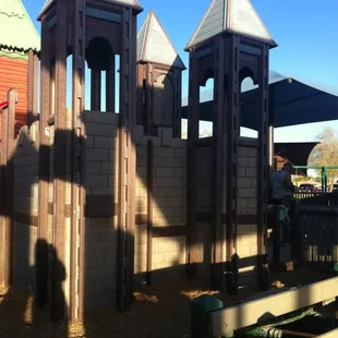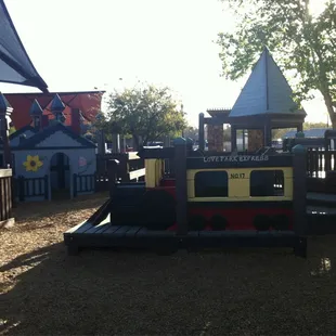 This playground is pretty cool. Thank you yelp for this great find! I took my daughter here and she had a blast. The best part, that its FREE! There is plenty places to sit and shaded areas. I like how they have the decor like castles and dragons and even a toddler area. It is near a railroad track, so it was pretty cool for my daughter to see the train go by.
