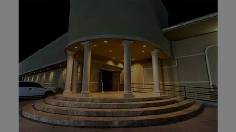 the entrance to a building at night