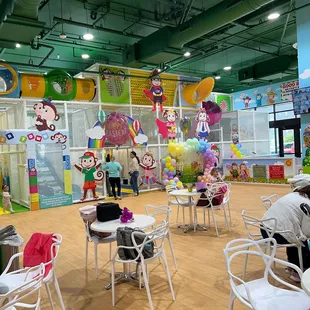 Service, even tho it was extremely busy the women behind the counter where so polite and patient. They where so kind we explained we where from out of town and it was our first time there, they informed us on all their services I ended up buying a bouquet of balloons and you can even choose the theme. Both my girls loved the place, as a mom the first thing is safety and cleanliness in these places. No complaints because the place was clean including the inside of the play grounds. Food was decent to snack on the tenders and fries where good. There is a baby area and a big kids area. Loved the place !