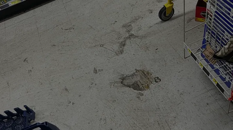 Trash, dirty floor, step stool, and product along with random carts just blocking not being used by customers