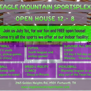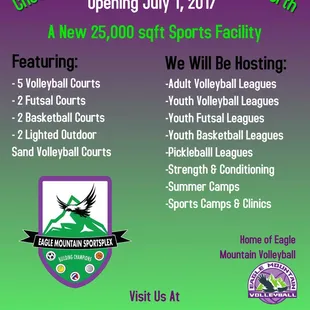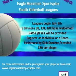 This is a great place to get into a volleyball league. The Eagle Mountain Sportsplex offers leagues for girls and boys. They also have indoor soccer. Outside there is a sand volleyball court too. This is a very well run and organized program. Outstanding.