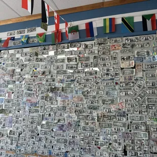 Wall full of money from different countries for people that visited here for good empanadas