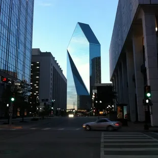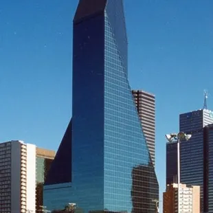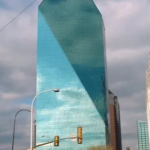 I worked in Fountain Place when it first opened in 1986. It was the most unique and innovative architectural structure that downtown Dallas had seen in a long time. It still stands tall, sleek, and beautiful today.I think my favorite thing about Fountain Place is the water gardens for which the building is named. When it first opened, Dallasites hadn't seen anything like it: the enormous prism of glass surrounded by an urban garden of water that flows over terraced cement and around potted trees. Nearby, a contagion of synchronized water choreography performs a seemingly impromptu recital from a series of holes cut in the marble, laid out in the shape of a linear vegetable garden. If you sit and observe it long enough, you will begin to see the cyclical pattern repeat itself. It has a hypnotic and relaxing effect. In the heat of the summer, kids would run and play in the water, squealing when they received a surprise spraying. You couldn't help but laugh at them. Adults who would get too close sometimes got caught off guard and, thus, ended up wet. Occasionally they would get mad, but mostly they would laugh.As beautifully as the building is designed, with it's elegant glass facade, the architects overlooked one nearly fatal design flaw...the building's steeply pitched angles. The exterior is a carved away design, ensuring it's 10 sides give the structure a unique appearance from every direction. What they forgot to factor in was Dallas' winter weather and, more specifically, ice storms.The first winter freeze allowed enormous sheets of solid ice to form on the building's giant angled surfaces. As the temperature rose above freezing, thus loosening the ice from the glass exterior, the first huge sheet came sliding down and shattered when it hit the sidewalk, narrowly missing those of us who were walking below as we attempted to enter the building for work. Many of us went straight inside to the building's management office to let them know what had happened. When I came out for lunch later that day, a huge portion of the surrounding public space had been marked off with orange traffic cones and yellow police tape. I think it's safe to say that while many of us narrowly escaped death or serious injury, I. M. Pei and Partners also avoided a costly law suit that could have put them out of business. If you are into celebrity, or have no life of your own, you might be interested to know that some scenes from the television show Dallas were shot here. Apparently, J. R. Ewing's fictitious office was supposed to be in this building, so they were frequently shooting in the lobby. It was annoying for those of us who worked here because they must have complete silence when filming. The floors were marble, and we were all dressed in business suits and high heels or dress shoes. There is no possible way to walk on marble in dress shoes or high heels without making some noise, so we were all forced to be mute, tip-toeing around in our stocking feet, dodging the film crew with shoes in hand...waiting until we got outside of the lobby doors before we could speak or put our shoes back on to go out for lunch, use the elevators, or any other time we had to enter or leave the lobby. One should never have to witness senior management in sock feet. It takes away from their air of authority and managerial competence. I am reminded of this every time I go to the airport and am forced to walk around in socks or bare feet while my shoes are scanned for plastic explosive (as if any woman is gonna blow up her favorite pair of Jimmy Choos!) But, I digress... Fountain Place is one of the most interesting architectural structures that I have seen anywhere in the world, and here it graces the skyline of little ol Big D. It's gorgeous, day or night. If the weather is nice and you're downtown, grab some lunch to-go and head over to the water garden. It's a great spot to soak up some sunshine, relax, and recharge your battery before you head back into the land of florescent light and cubicle monotony.