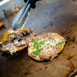 Our burrito comes in a large flour tortilla with Spanish rice, refried beans, birria (shredded beef), grilled and pickled onions, cilantro, and salsas on the side.