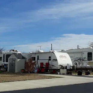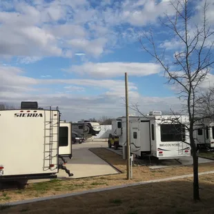 Awesome RV Park. Very nice concrete sites. The laundry room is large with lots of washers and dryers. There are two areas in the laundry room to sit and read or watch tv if you want to hangout and wait. There is a clubhouse that is vey large and well equipped for entertaining. The office staff is aldo friendly and helpful. I highly recommend this RV Park.