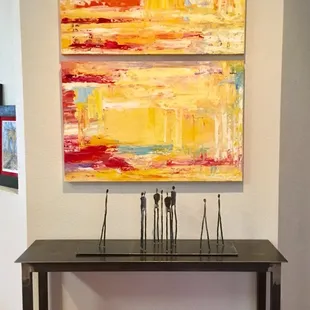 If you're a true fine art lover and/or collector without a millionaires budget, then moment you walk in you know you're in the right place. I was originally drawn to Giddens because I was looking specifically for Manuel Sarmiento's new 'home' after the Artisan's Collective in the BAD closed down (wahhhh) & found he has quite a bit of work here. Also my daughter needed to research female artists for her an art class assignment, so I just happened to be able to have my cake and eat it too here. That day we both accomplished our goals and she walked away with a plethora of (LOCAL) artists to be inspired by and bring to the attention of her instructors and classmates; I walked away with 3 pieces I LOVE. Two pieces (a sculpture and table) by Manuel Sarmiento & a diptych by Rosemary Riddle-Achelpohl. (See pics, aren't they amazing!) Let me also say that a great bonus to this gallery is that it's staffed by said artists, not just someone there just for a paycheck. What a joy to be able to speak with them about their work, hear their stories & see their passion for their craft. There's nothing like having a direct connection to the artists themselves. But don't fret, they know not only about their own work but have vast knowledge on all of the Gallery happenings and other artists showing in this gallery. So ask away about anything and if they don't know the answer they will jump through hoops to get it. Talk about Service! I was so impressed with the time and energy spent on both myself and my daughter in our different goals for the trip. AND when you're talking about Service, they not only delivered but the OWNERS of the gallery delivered to me. They are incredibly friendly, helpful and treat your new art and home with great respect and care. Cherie is also an artist featured in her gallery as well & it shines through that she truly loves both aspects of her profession; both being an artist AND representing the wonderful artists she curates. Don't miss this gallery if you are out shopping for art or if you're just in Grapevine and want a lovely experience seeing local artists' works.------- UPDATE: kiddo had an assignment to hunt down artists to showcase at class again. I bought art again! It's impossible to resist when there are some truly remarkable artists represented here. Shockingly I didn't walk away with a Sarmiento piece this time. Picked up a watercolor by Naomi Brotherton that I'd eyed last time & couldn't stand to lose the chance to own this time around. The pic I took is awful, but if you know your art mediums, you can clearly see how remarkable it is that this was done in watercolor. Ms. Brotherton is truly mind-blowing in her talent, a master! As usual Cherie was helpful, focused, accommodating, knowledgeable, and a bonus; she's thoughtful. She remembers her clients on sight. She remembers what they bought. She cares! GO to GIDDENS!!!
