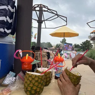 This location is now called "Hawaiian Waters". We got there around 11am and it was easy to find 4 chairs. There were multiple large groups there (YMCA/Denton ISD) so the lines were longer waits but the food/drinks were good. We took one cooler bag with water and another larger bag with chips, towels and water toys. There was no issue with any of that. For three adults and one kid we spent about $65-$70 for meals/dessert/drinks. All in all it was a great day!