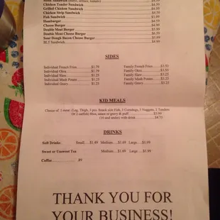We called in an order on the way through town. I ordered that catfish dinner 5 piece. It came with coleslaw and fries, but only 4 pieces of fish. They were bigger pieces but four not five. Coleslaw was terrible and fries were old and greasy like they were dropped in the oil to reheat. Fish was good! Husband had 6 piece tender meal, only came with fries. Kids meal chicken nuggets came with 3 nuggets like you would get out of a Tyson chicken bag. No flavor except grease taste. Fries again were disgusting and old. Two large half and half teas. Perfect not too sweet. Outside the building has tall weeds growing in their asphalt, trash all over, inside the floors had so much food and spilled drinks. Entire place could use a little TLC by just normal maintain and clean. Credit card fee is 5%. There is NOT a single credit card company who charges that so of course they are making profit there too.