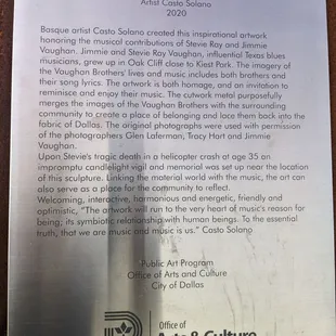 Since this is a park I feel free to give Five stars for sentimental value!!!!I grew up in Oak Cliff Texas. This is a section of Dallas in the western region of the city limit. At one time it was populated by the working class. One of my acquaintances and peripheril friends was Stevie Ray Vaughn. We went to the same elementary and High School.This park was a " Hang out" back in the day. Now,I didn't do much hanging out here and I'm not sure about Stevie. I do know his childhood home is right down the street. So possibly when the City of Dallas decided to honor Stevie and his brother Jimmy,Kiest park was a good place to do it.Last September which would have been Stevie's 67 th birthday,a memorial steel art sculpture depicting Stevie Ray Vaughn and Jimmy Vaughn was dedicated here.Stevie was a great musician taken from us way too soon. I think the City did a great job remembering him with this surprisingly good steel sculpture.If you're in Dallas,it's definitely worth the trip. If you are a Stevie Ray fan, it's a must do.Go!