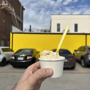 a hand holding a cup of ice cream
