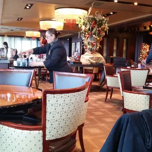 If you get the chance to go here, I would take advantage! I've been for dinner and brunch, and been impressed every time. I think lunch is the busier time here since there's lots of people doing business, but I only come here as a spouse for events or a treat out, so I can't really say how lunch goes. There's a very snazzy cocktail lounge (though I cannot vouch for the bartenders and their range just yet, being quite pregnant) and even better--a little area outside the main dining room with an outdoor fireplace. Looks like a very cozy spot I would love to take advantage of when I'm able to drink again! The service is always tops, needless to say, and the hosts always seem to go out of their way to be very friendly.Specials change monthly and they're all very delicious sounding. I went the easy route last time for dinner and went for the filet mignon--for which I was told I did not need a steak knife because it was *that* tender. I have to say, it was in fact, pretty damn fine. If you do go for dinner, save room for dessert, and in particular, the cherries jubilee! They have 2-3 flambe desserts, but wow was that one good. They're a little pricier because they are for 2 people minimum, but considering the fun floor show you get, definitely worth it. ;)Valet in the garage of the building gets validated at the front! Ladies' restroom is also always spotless--complete with entry-way lounge!
