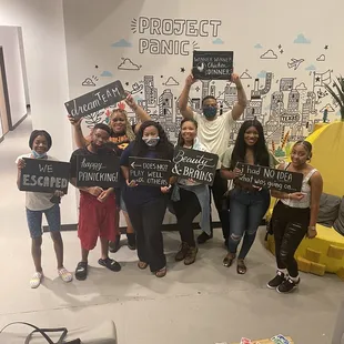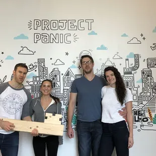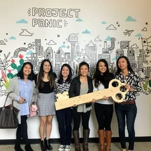 Daughters first escape room ! Posing at the wall of the Project Panic.